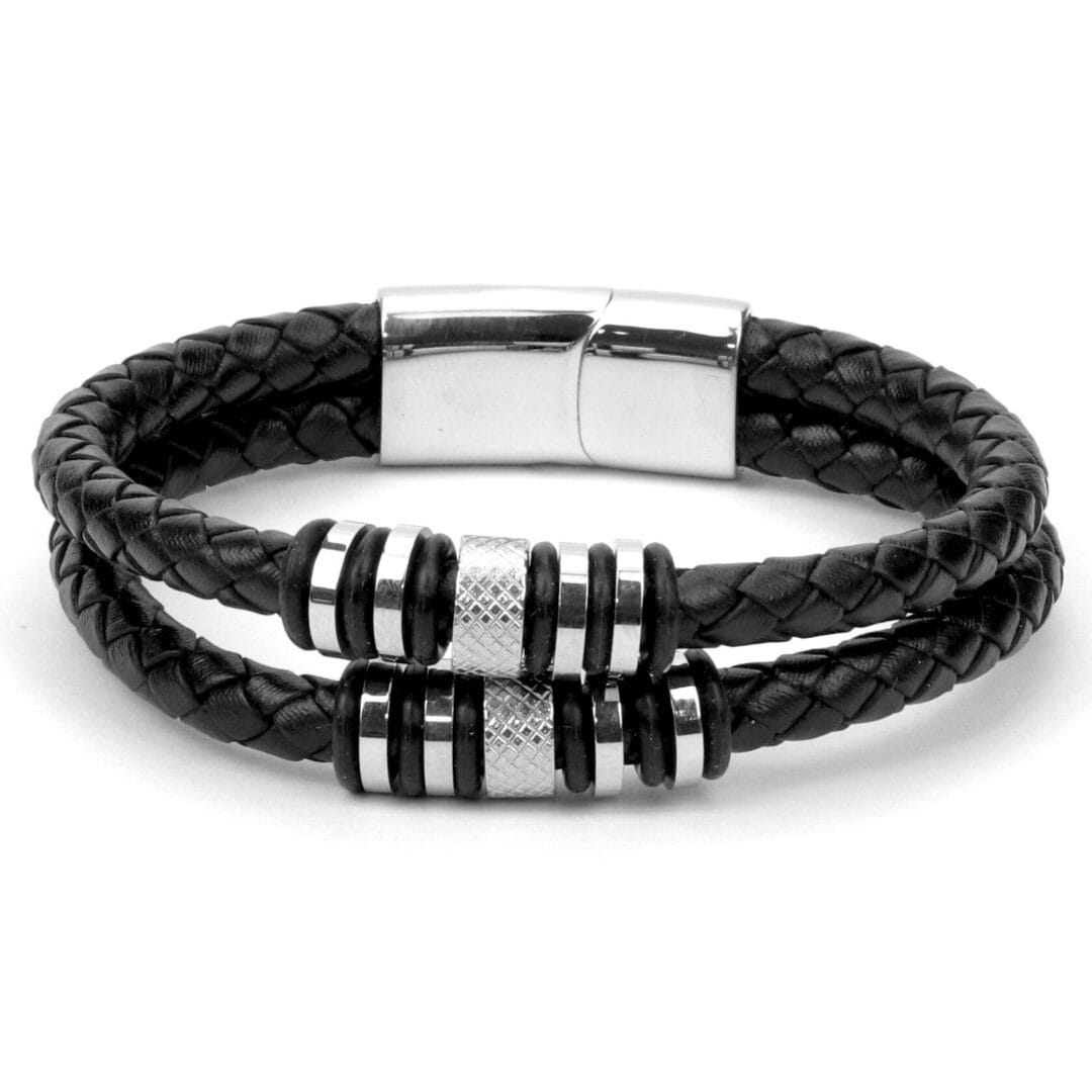 Bracelet Luxe Dual Cuir Véritable & Acier Noir