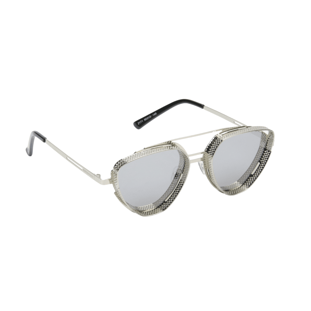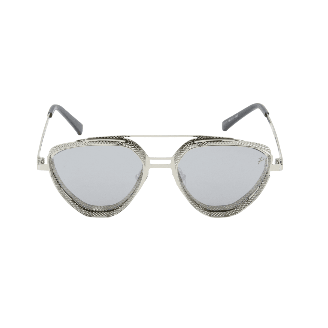 Forme aviateur futuriste avec structure métallique sculptée et double pont central. Look géométrique à effet ajouré pour un style affirmé et contemporain.