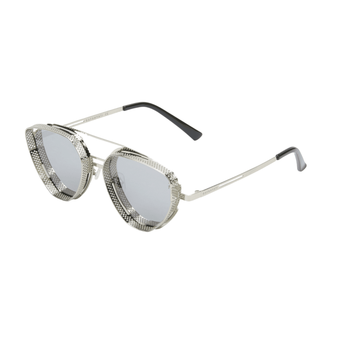 Affirmez votre style avec ces lunettes de soleil uniques signées Rafahyati. Avec leur design aviateur revisité et leur monture métallique ajourée en relief argenté, elles incarnent un esprit architectural, audacieux et ultra-moderne. Un véritable bijou pour les amateurs de design avant-gardiste.