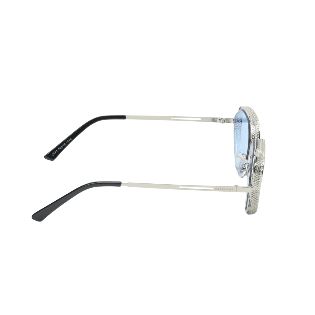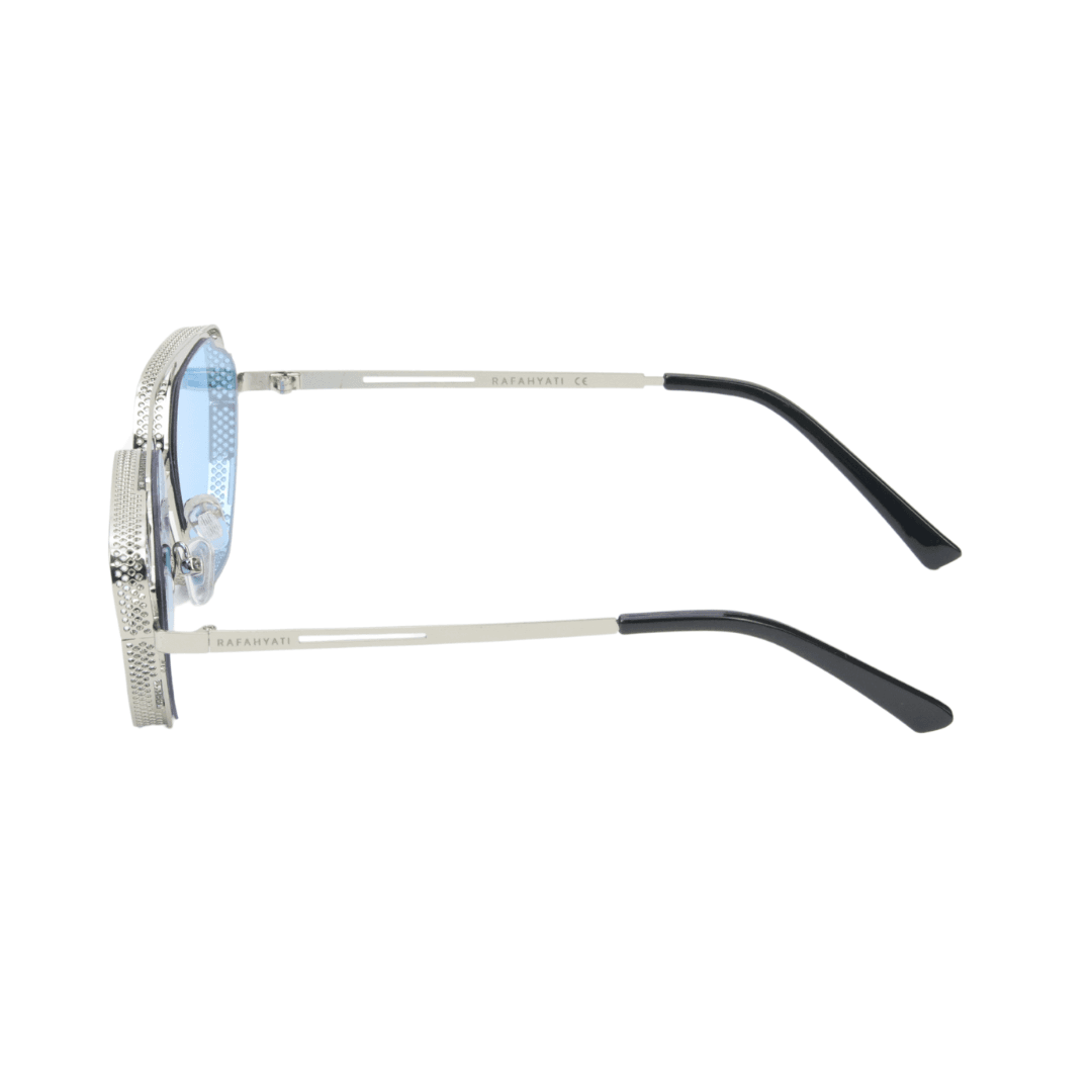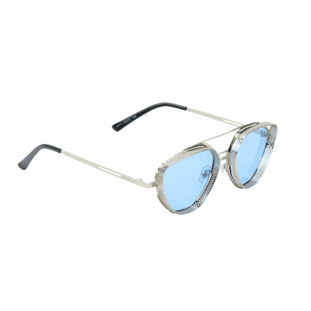 Affirmez votre style avec ces lunettes de soleil Rafahyati à monture en métal argenté sculpté, au design avant-gardiste et structuré. Parfaites pour ceux qui recherchent un look moderne, assumé et audacieux. Les verres bleu ciel polarisés apportent une touche de fraîcheur et de caractère à cette monture unique.