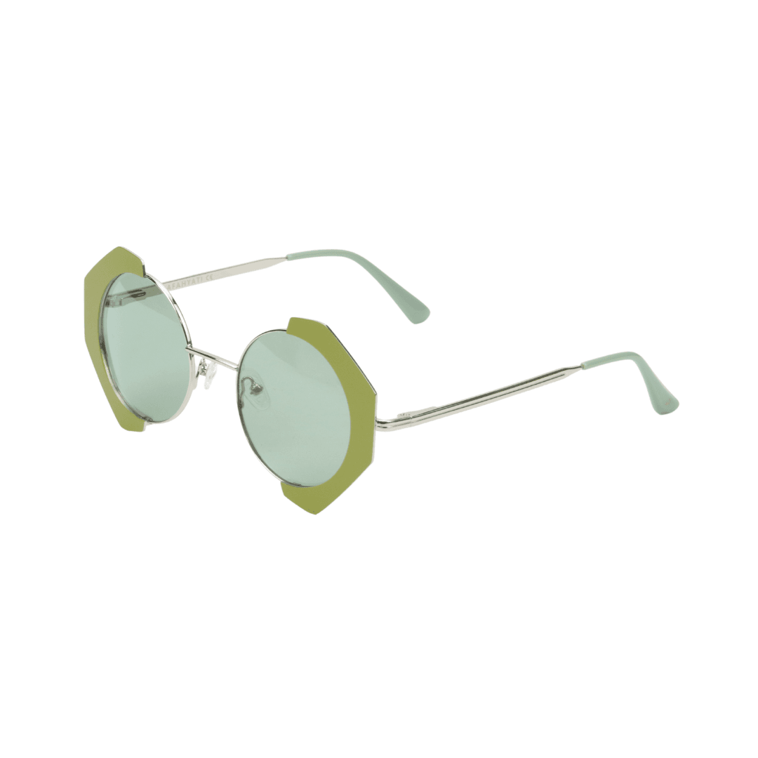 • Design : Monture ronde en métal avec des inserts géométriques olive, apportant une touche futuriste et unique.