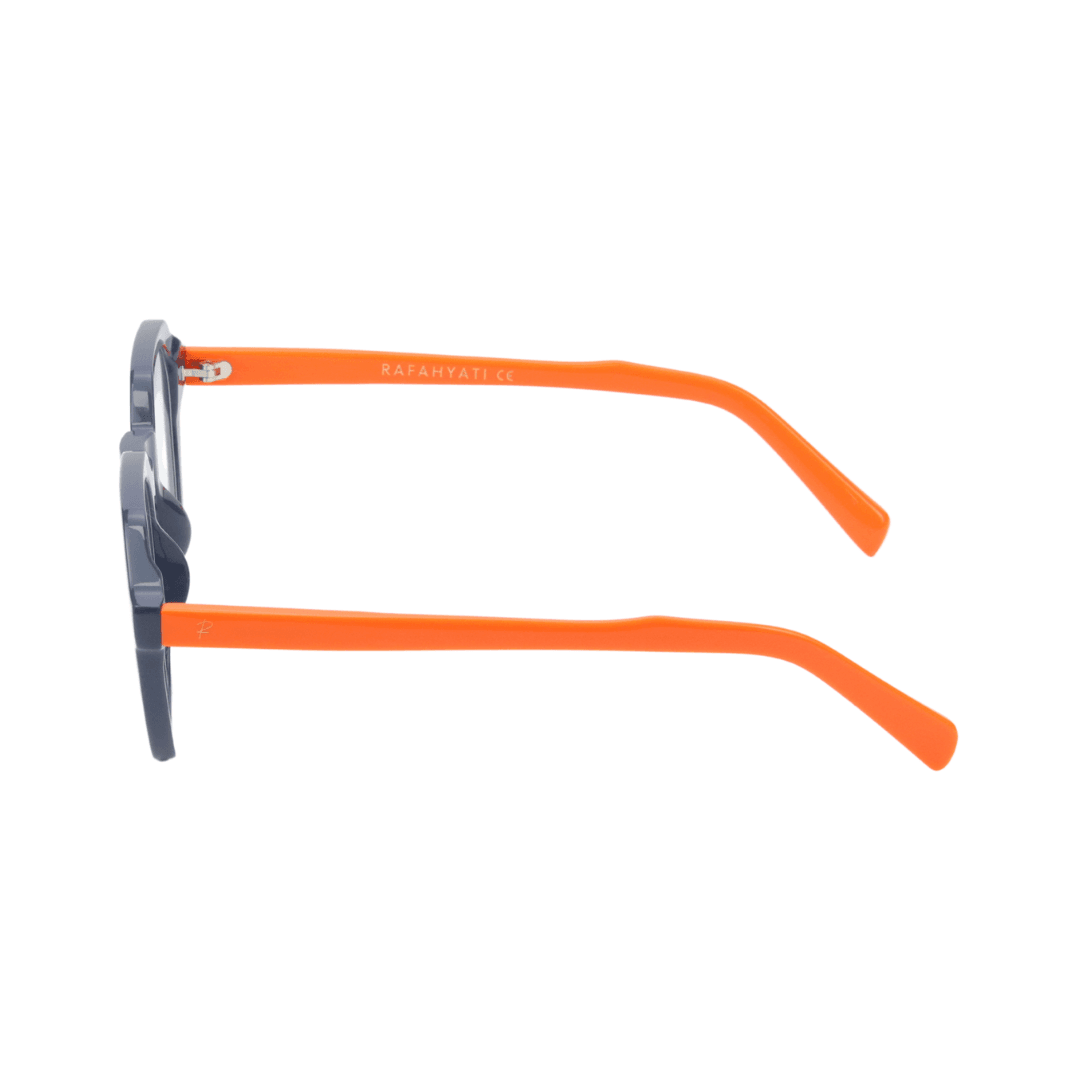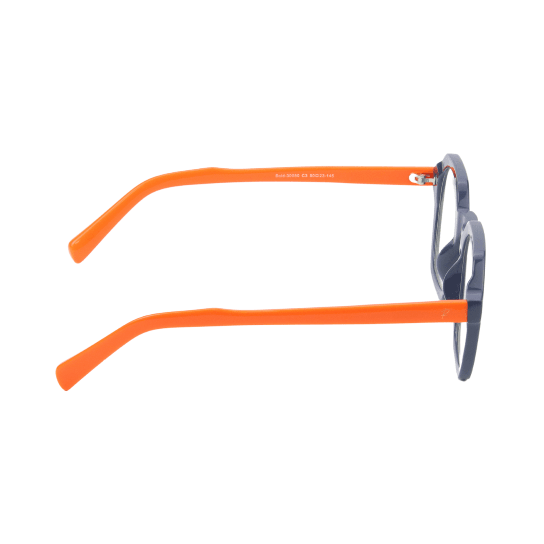 - Design : Monture rectangulaire au design structuré, combinant une finition bleu foncé et des branches orange vif pour une touche dynamique.