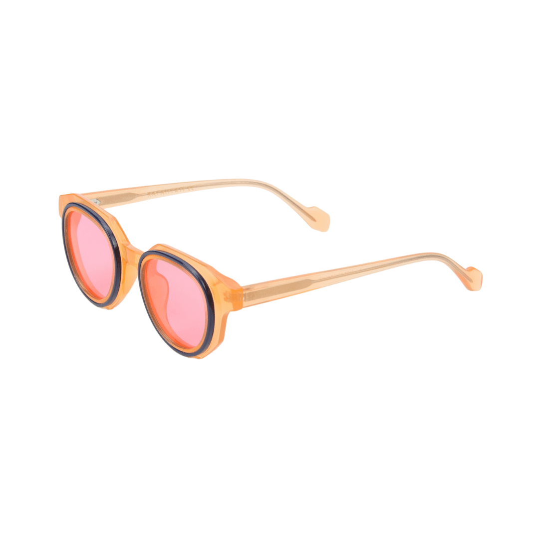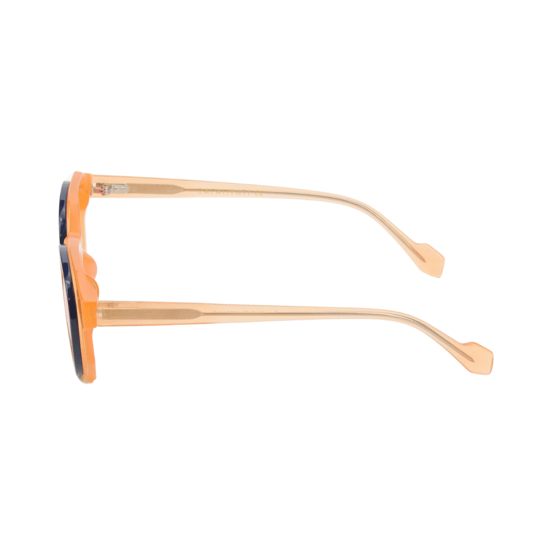 Design : Monture arrondie en acétate translucide orange avec cerclage noir profond, offrant un contraste visuel fort et tendance.
