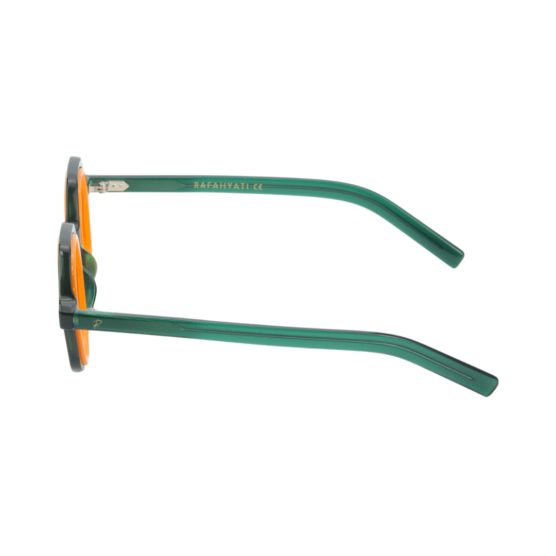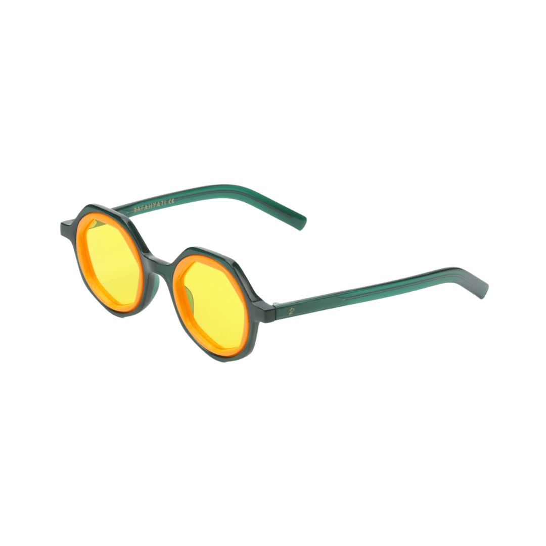 Affirmez votre style avec les lunettes de soleil Rafahyati, conçues pour allier originalité et protection optimale. Leur monture hexagonale en acétate vert profond, associée à des verres jaune orangé, crée un contraste audacieux qui ne passe pas inaperçu.
