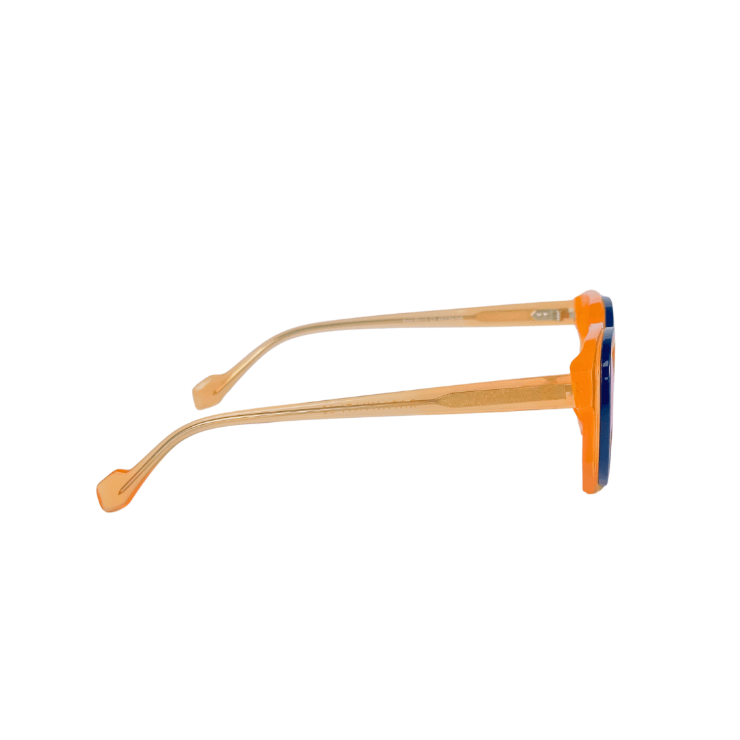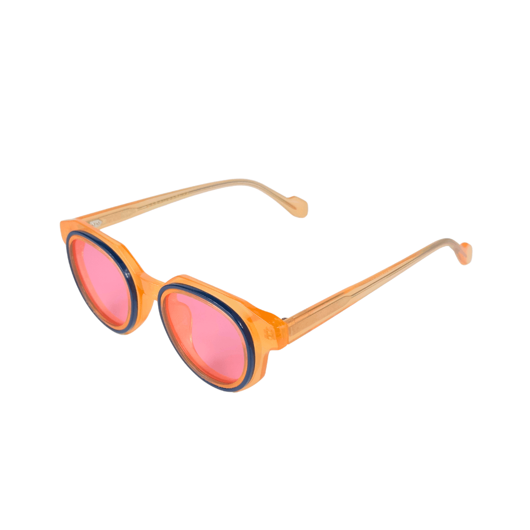 • Design: Forme Rond (round),Couleur de la monture Orange translucide avec détails bleus, Style Moderne et audacieux