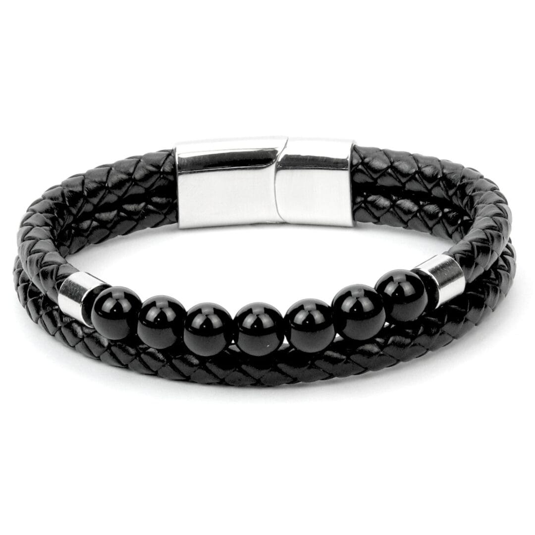 Bracelet Homme Rafahyati – Cuir Véritable & Perles Noires en Onyx