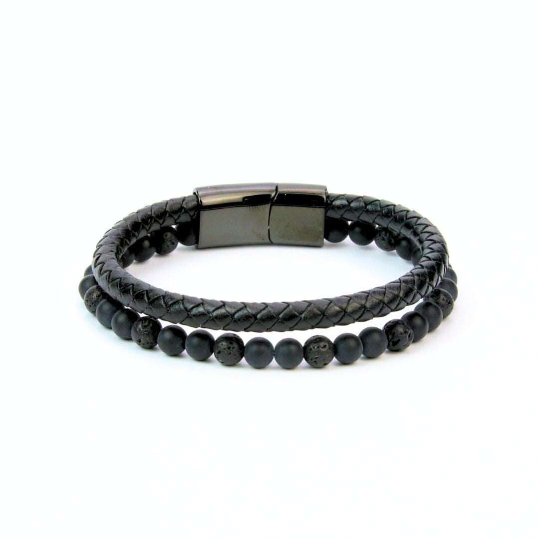 Matériaux : Cuir véritable tressé, perles d’onyx noir et pierres de lave.
