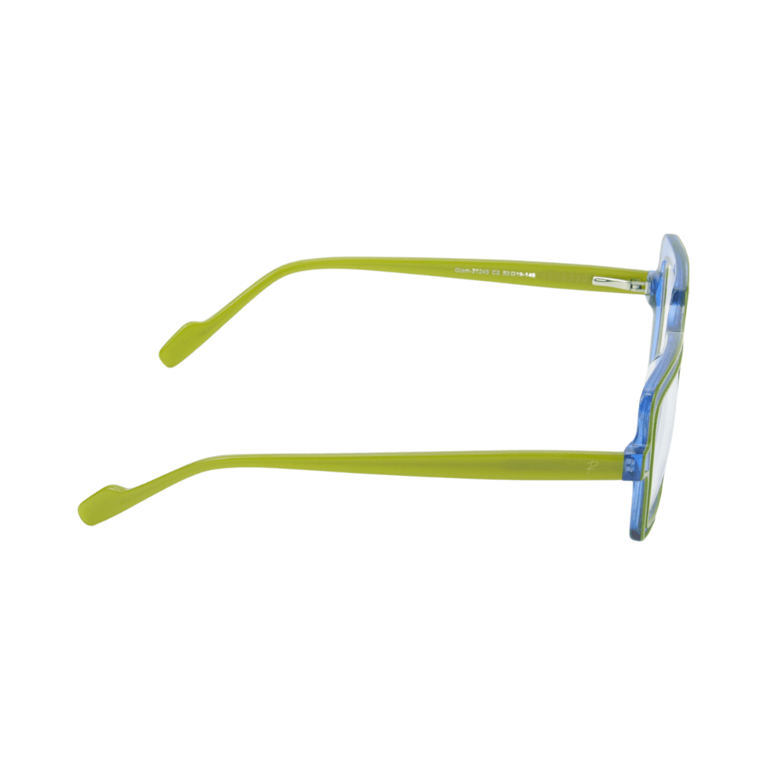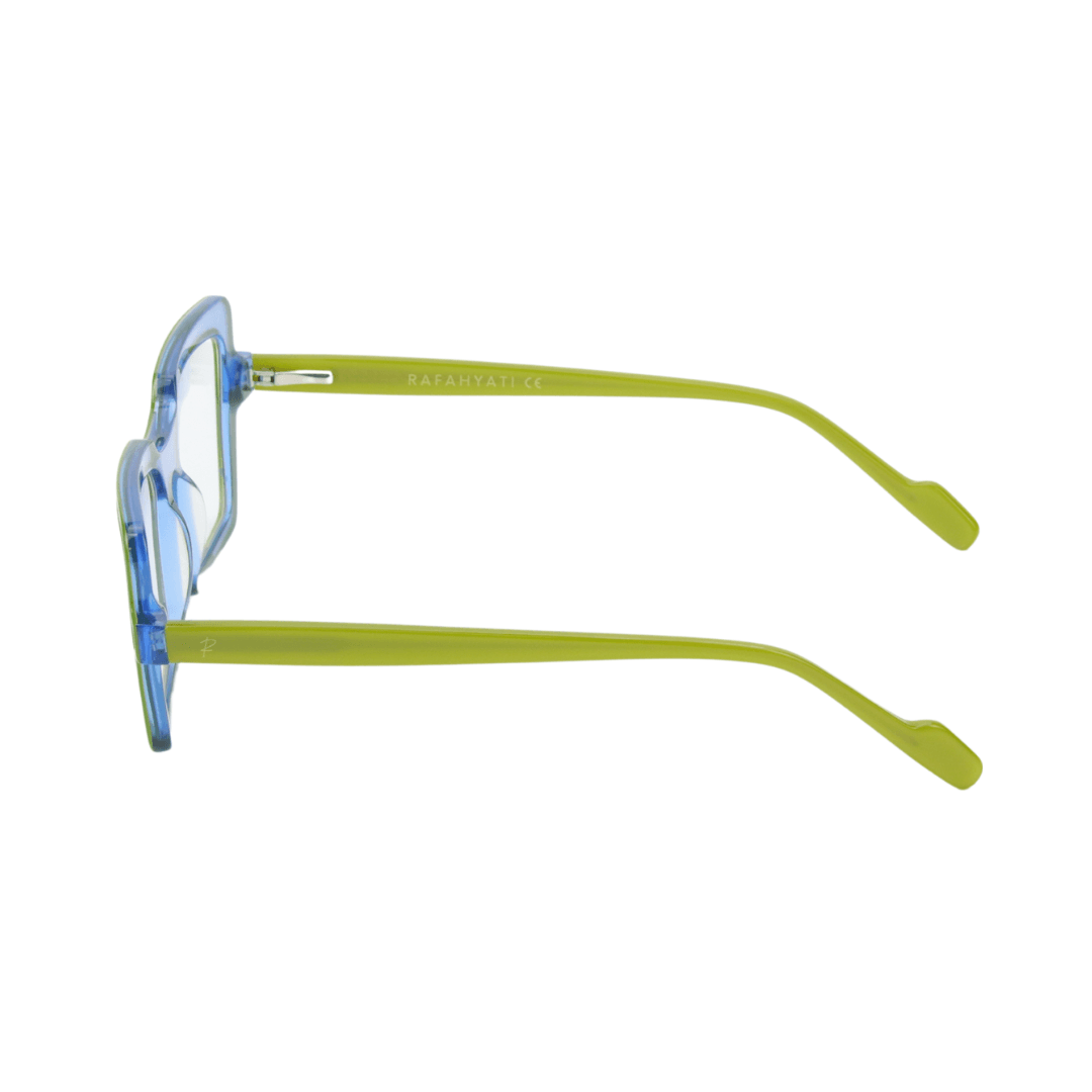 - Design : Monture carrée aux découpes graphiques, avec une finition transparente bleu et vert pour un effet avant-gardiste.