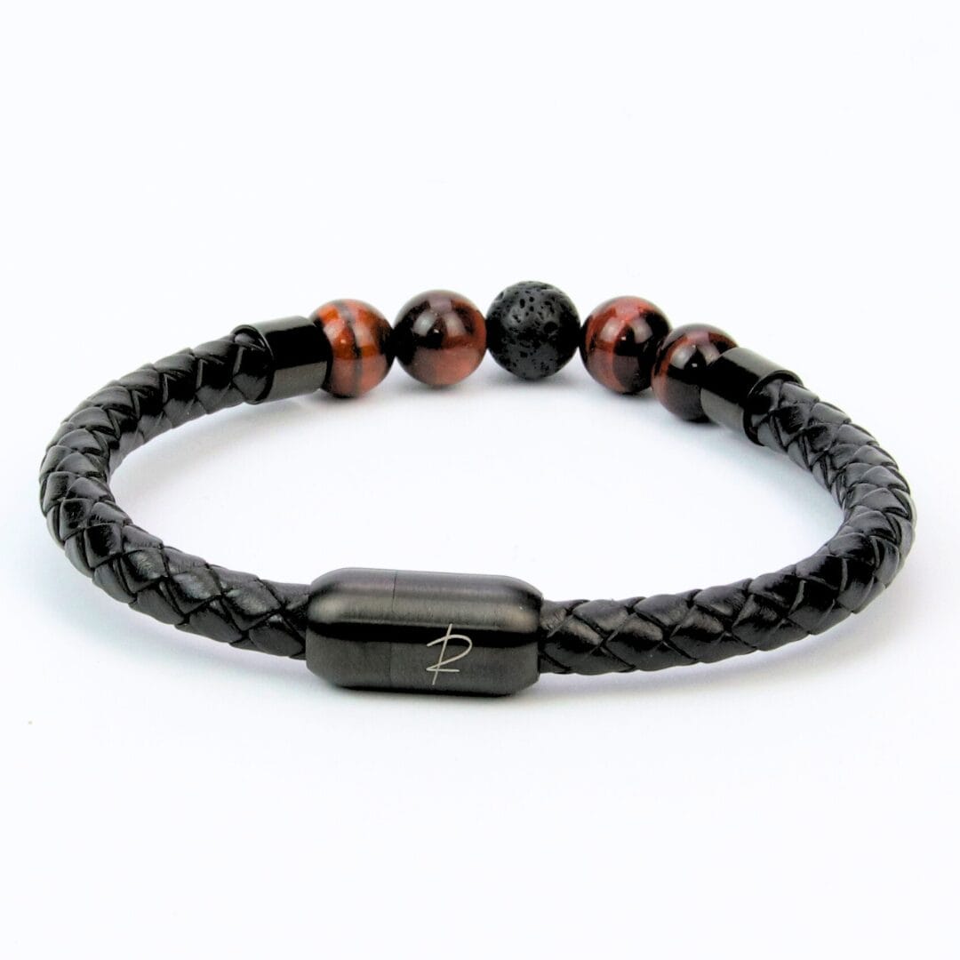 Orné de perles d’œil de taureau aux reflets profonds et de pierres de lave aux vertus énergétiques, ce bracelet est le symbole d’une virilité affirmée et d’un raffinement ultime. Son fermoir magnétique en acier inoxydable noir garantit une fermeture sécurisée et une finition haut de gamme.