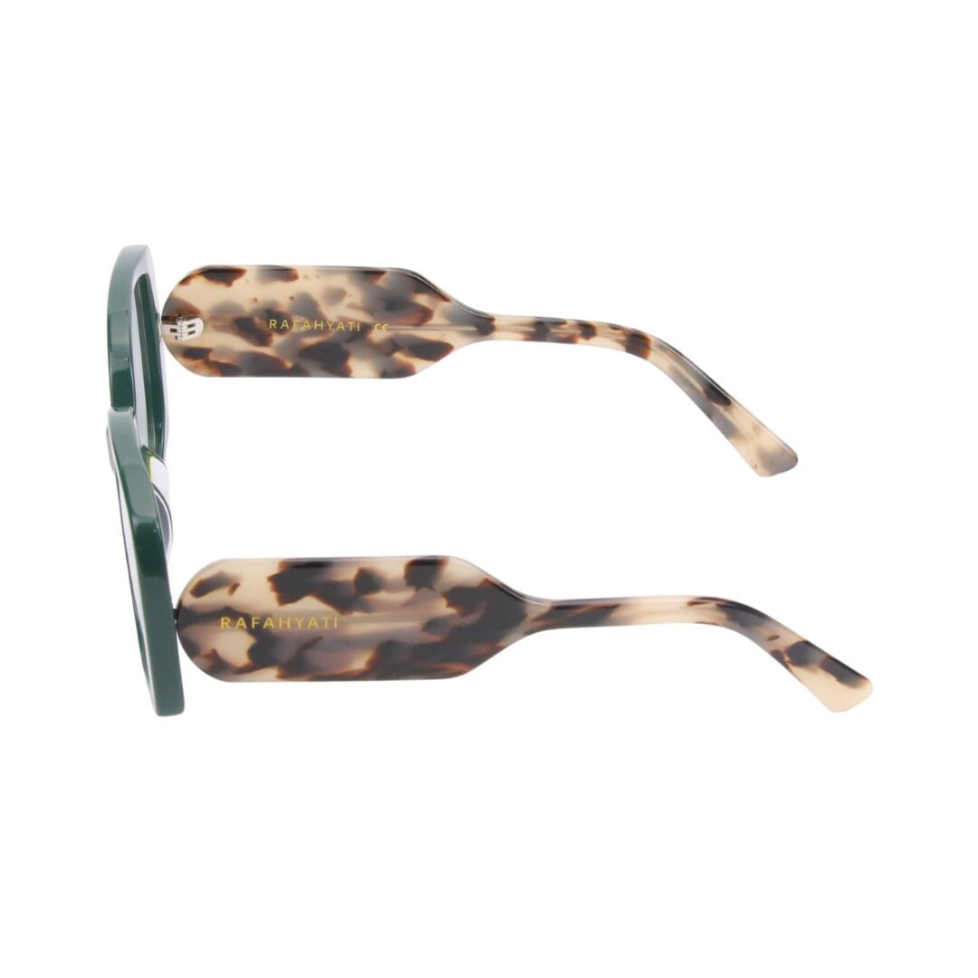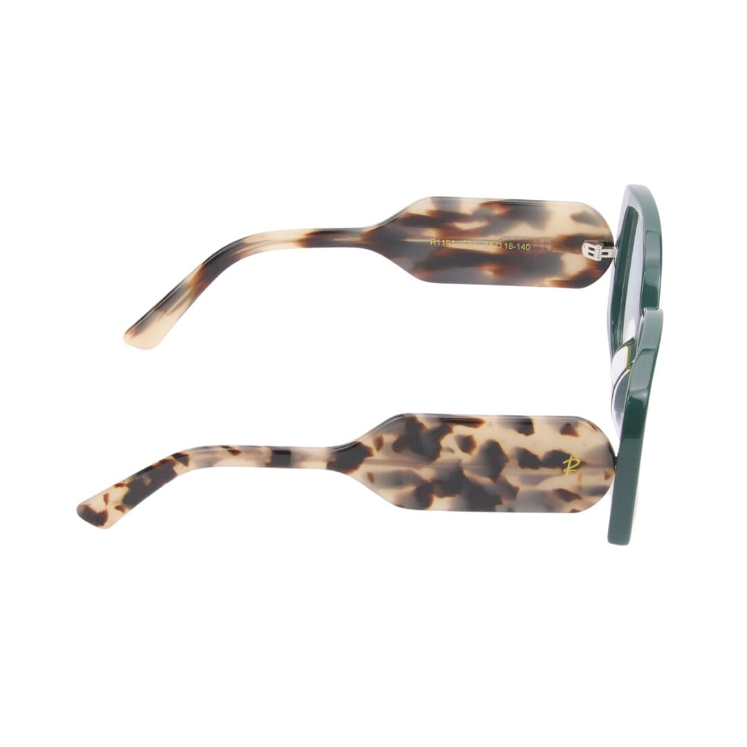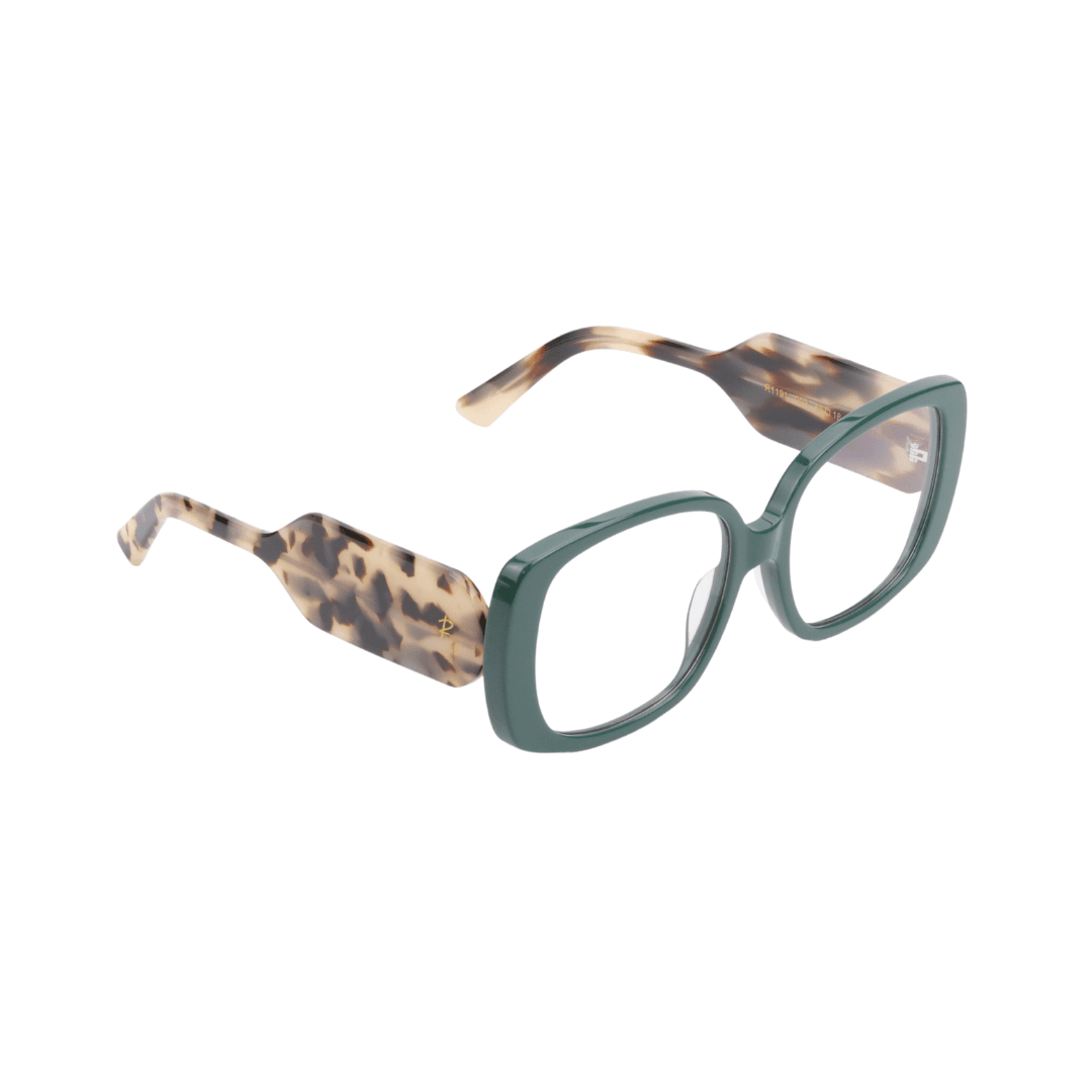 - Design : Monture carrée aux lignes marquées, combinant un vert profond à l’avant et un motif turtoise (écaille de tortue) sur les branches pour un contraste unique et élégant.