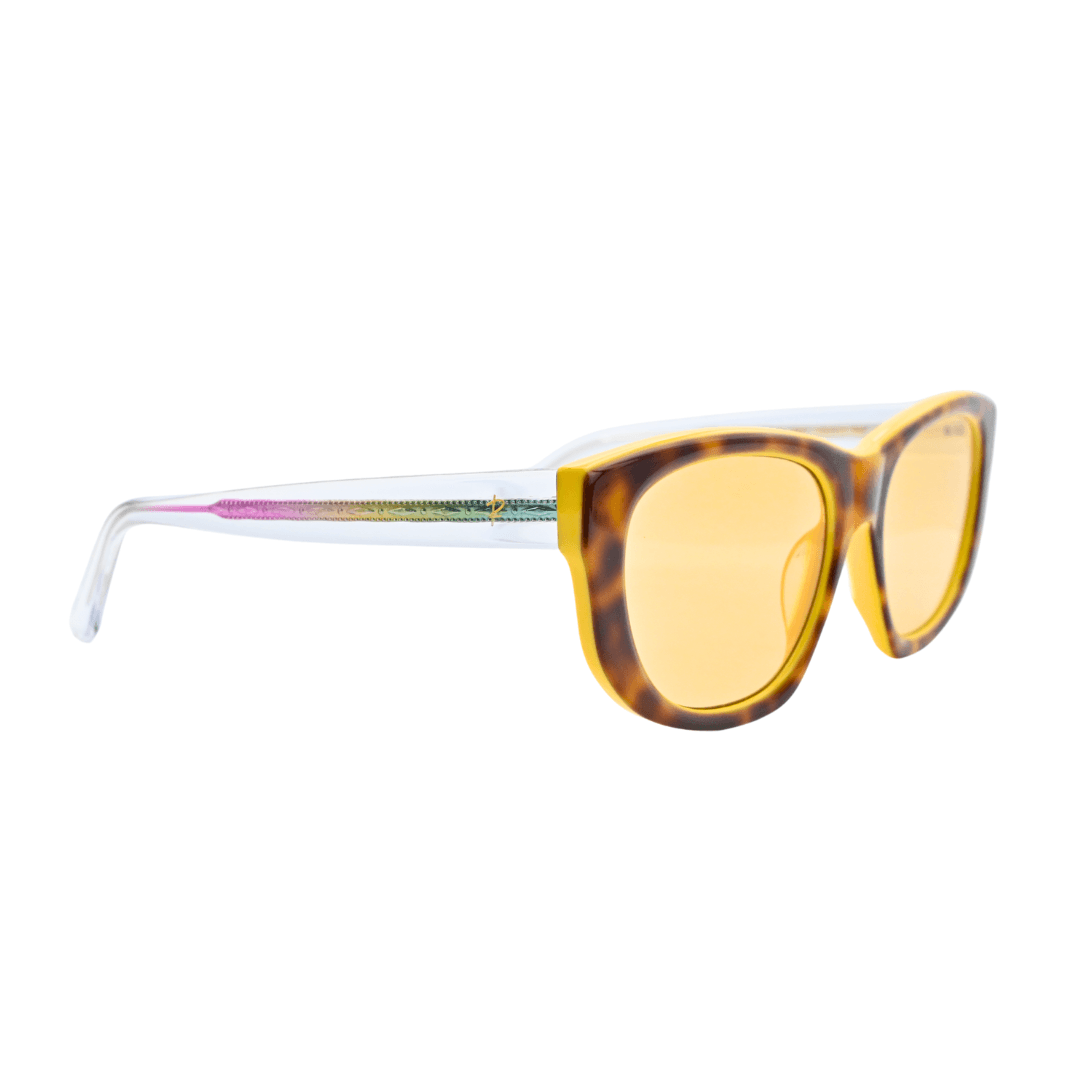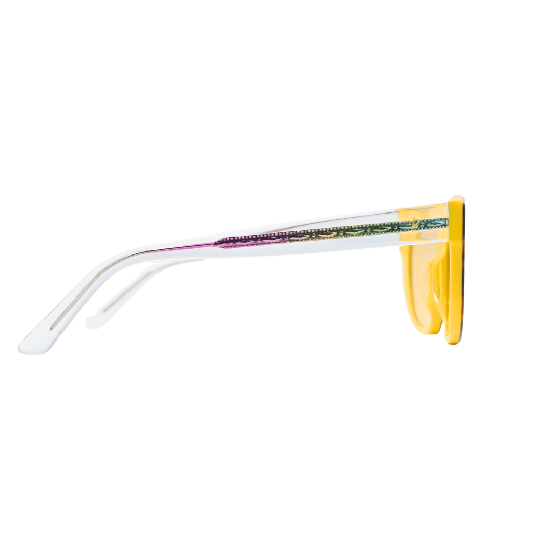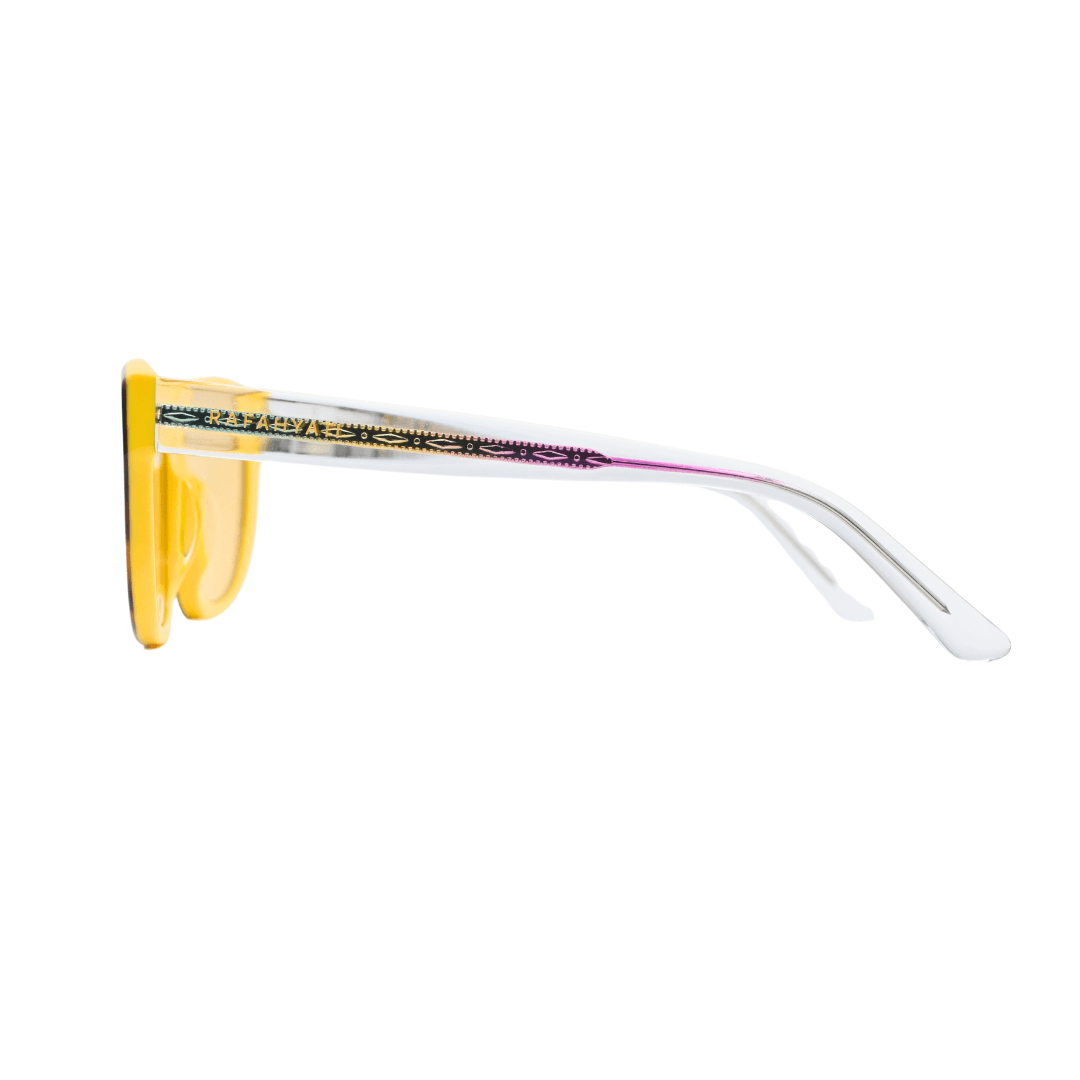 Alliez audace et raffinement avec ces lunettes de soleil signées Rafahyati. Leur monture œil de chat (cat eye) en acétate écaille, associée à des branches transparentes subtilement décorées de motifs multicolores, apporte une touche artistique et moderne. Leurs verres jaune clair confèrent un style affirmé tout en offrant une protection optimale contre les rayons du soleil.
