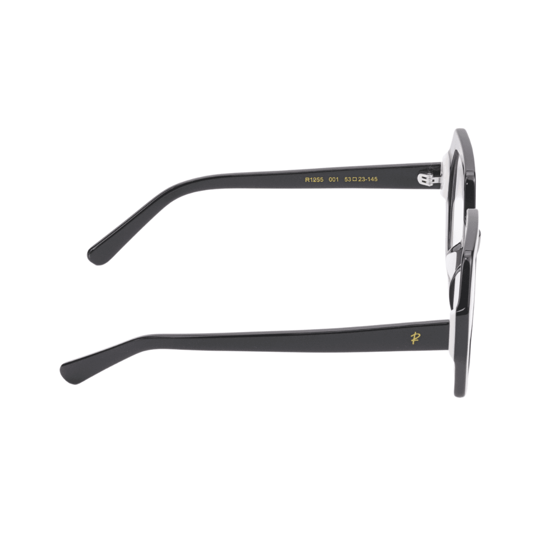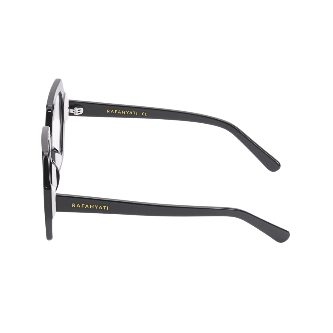 Affirmez votre style avec ces lunettes de protection Rafahyati au design géométrique audacieux. Leur monture noire en bio-acétate de très haute qualité allie élégance et robustesse, idéale pour un look moderne et distinctif.