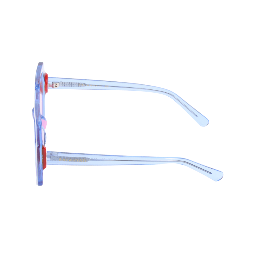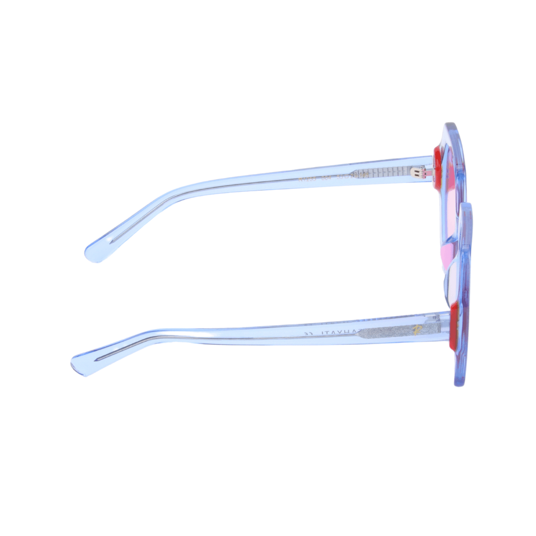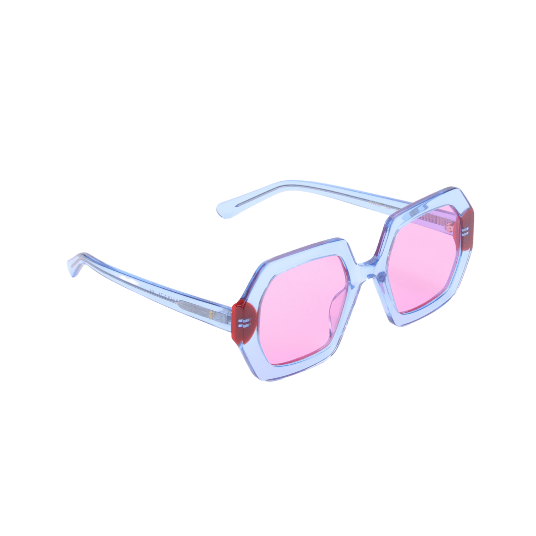 Osez l’audace avec cette monture unique, pensée pour celles et ceux qui souhaitent allier modernité, éclat et caractère. Ce modèle géométrique au design affirmé se distingue par ses verres rose clair et sa structure bleu translucide rehaussée de touches rouges sur les coins — une signature esthétique résolument contemporaine.