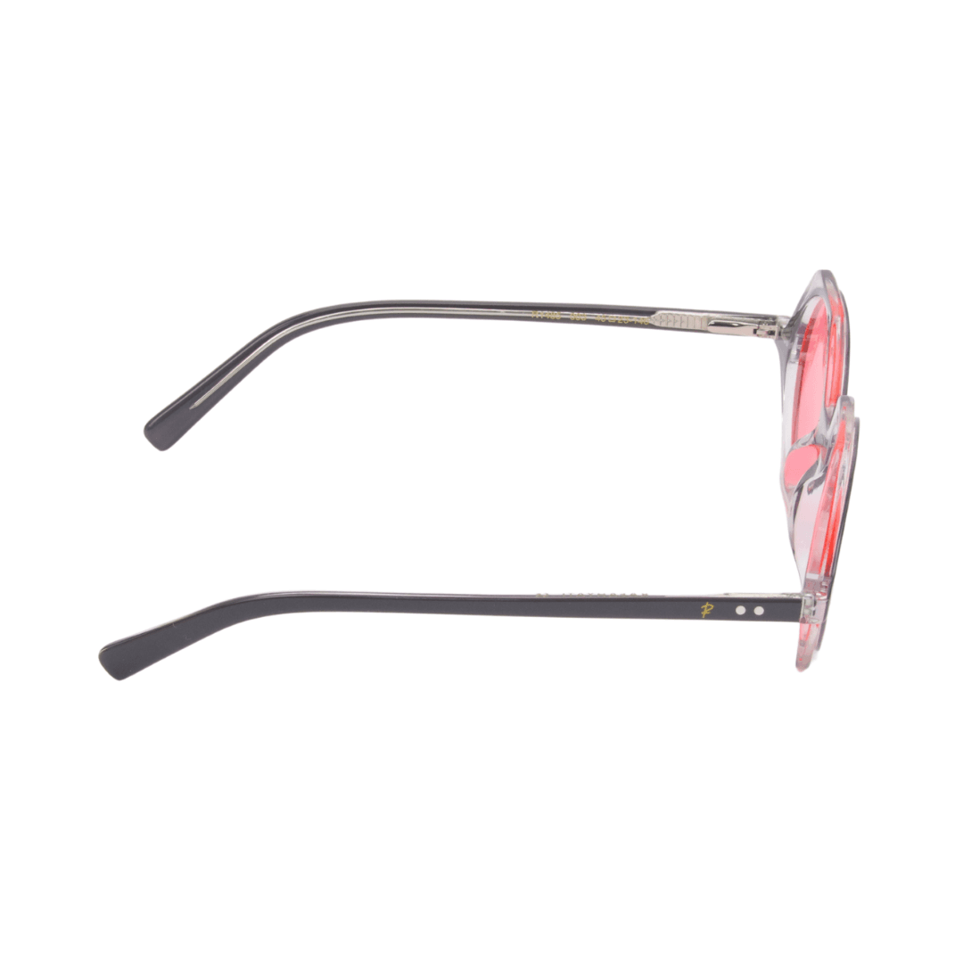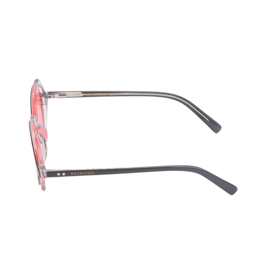 Design :Un design hexagonal audacieux avec une monture bicolore noire et transparente, rehaussée par des verres aux teintes rouges pour une allure sophistiquée et originale.