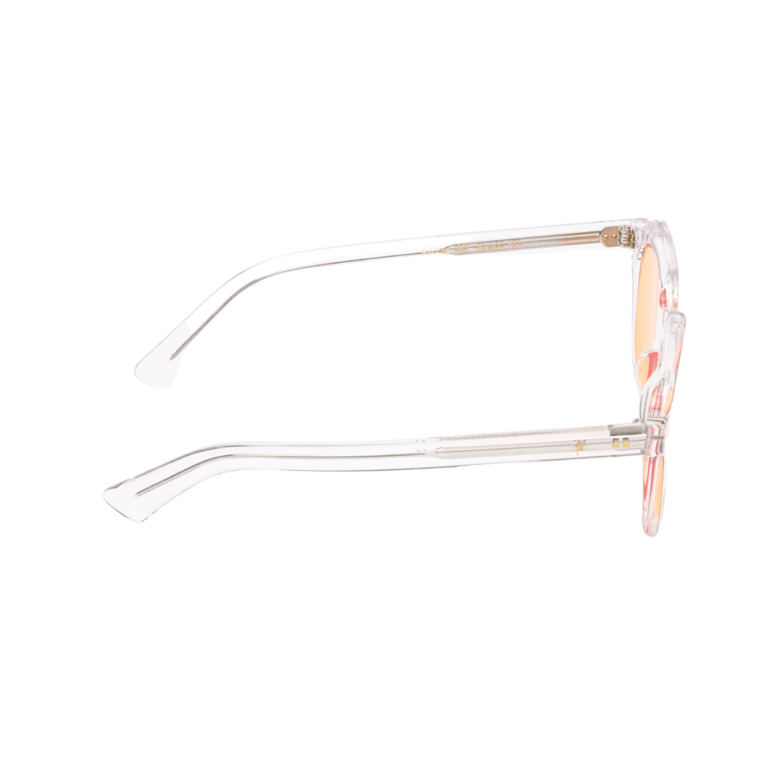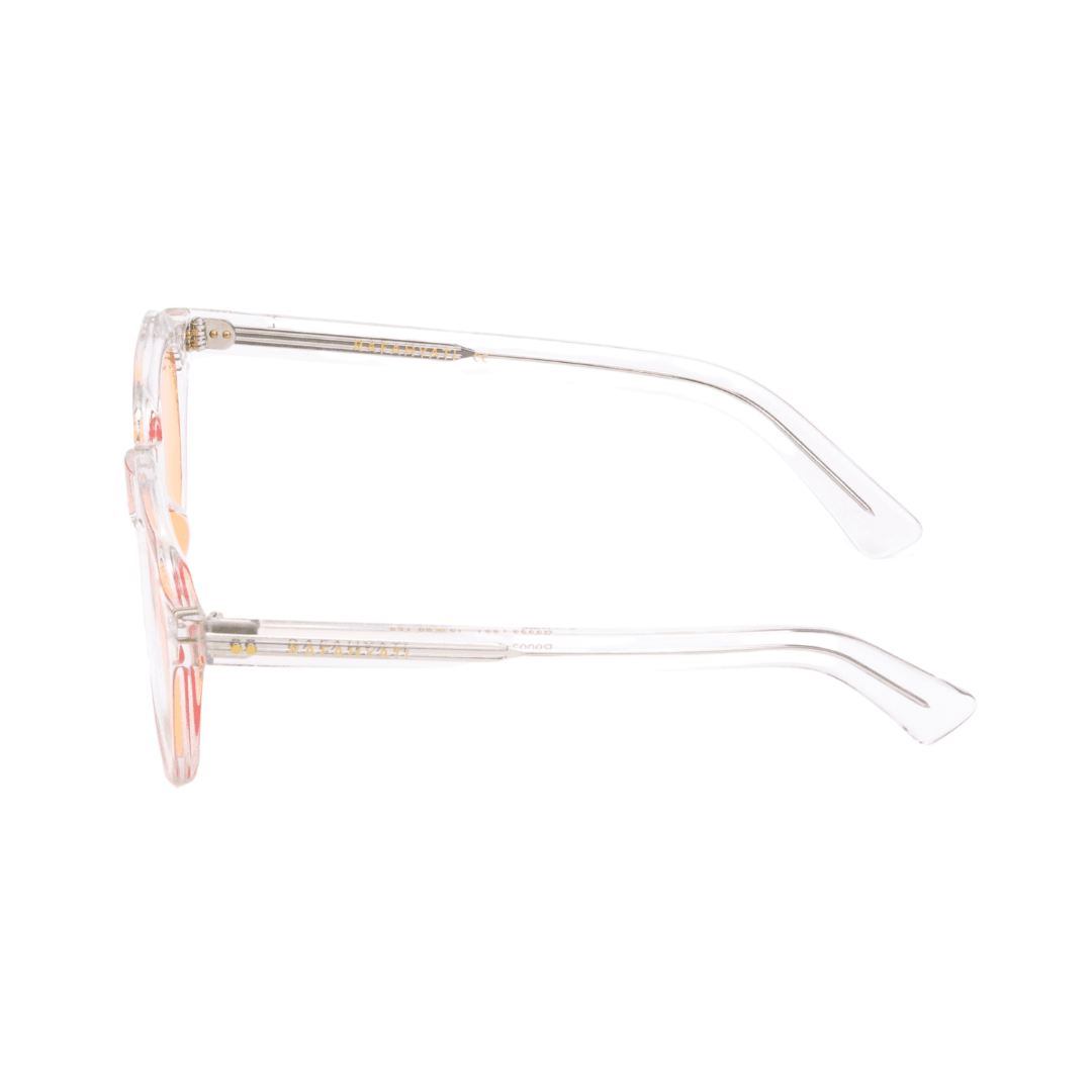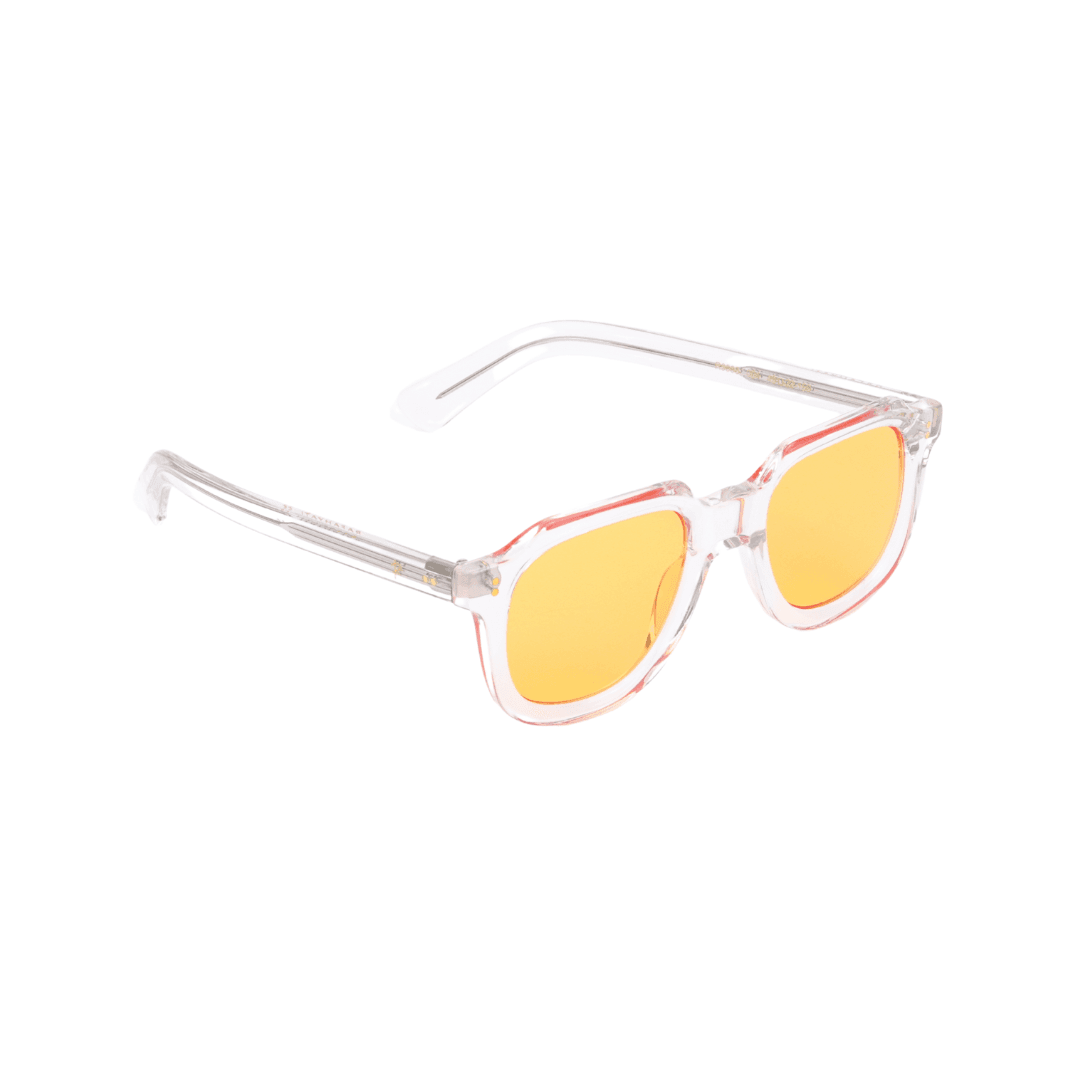 • Design : Monture carrée transparente avec des accents orangés, pour une esthétique audacieuse et lumineuse.
