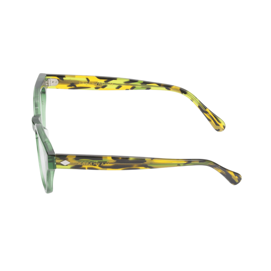 Apportez une touche de modernité et d’élégance à votre style avec ces lunettes de protection Rafahyati. Leur design raffiné, combinant une monture verte translucide et des branches à motif écaille jaune et noir, en fait un accessoire incontournable pour un look sophistiqué et original.