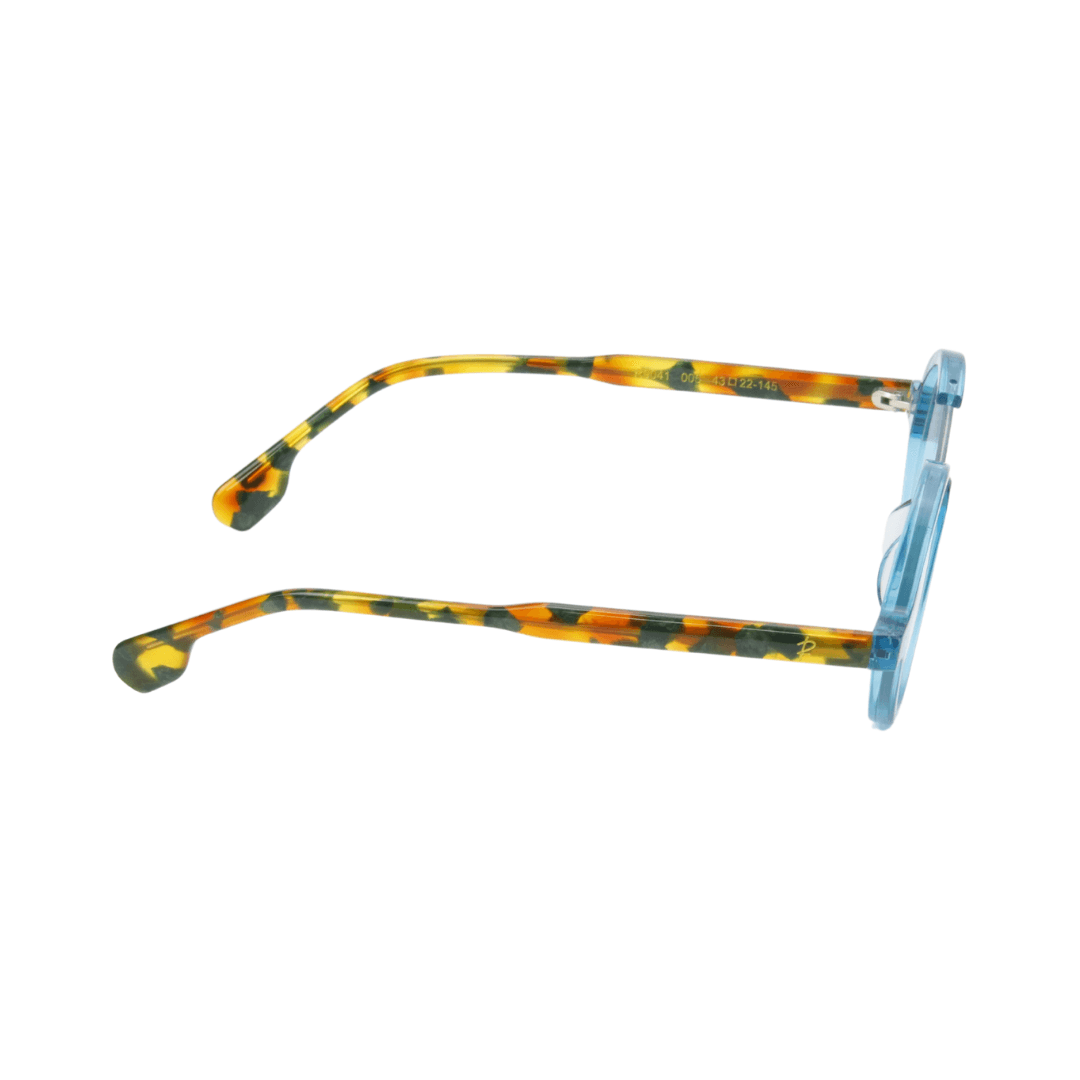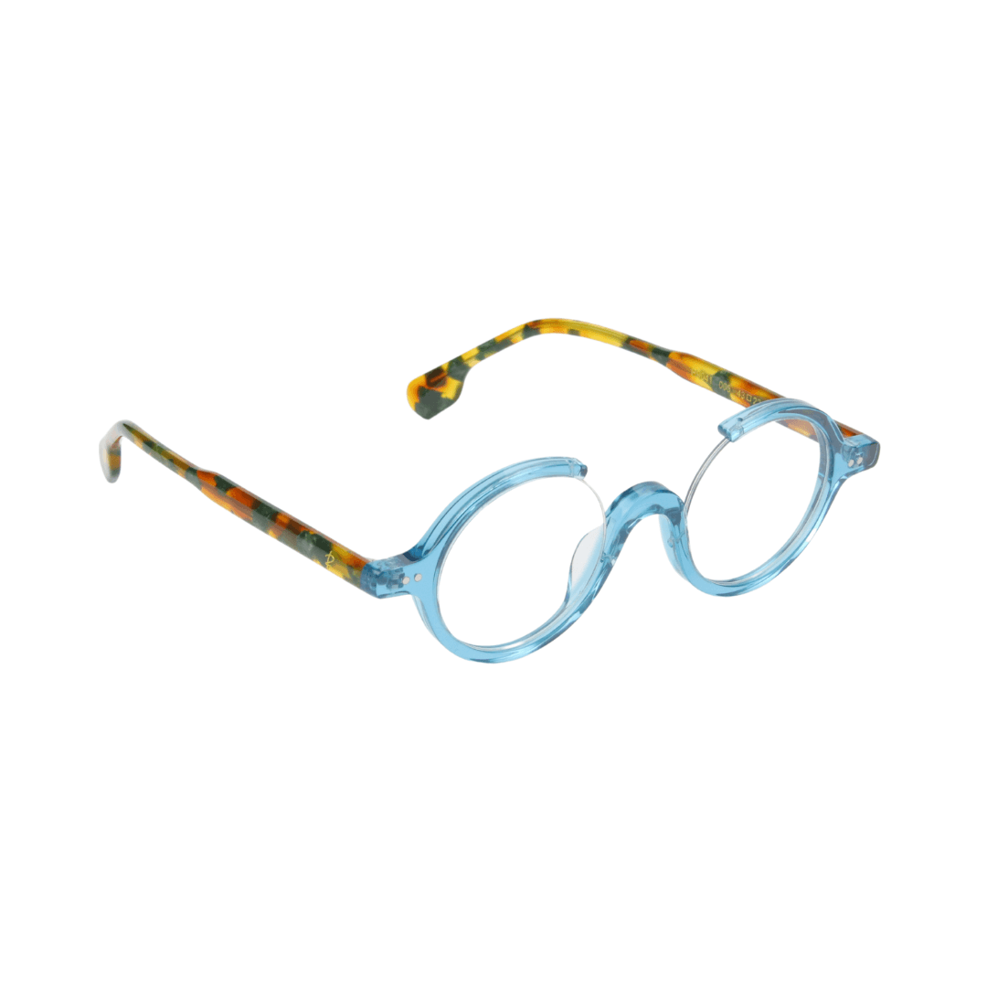 - Design : Monture ronde en bleu translucide avec des détails sculptés, accentuée par des branches en motif écaille vibrant.