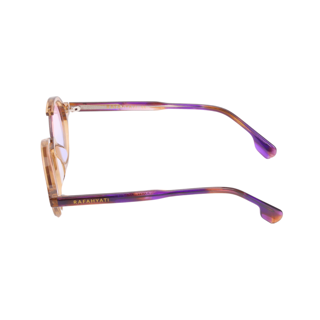 Alliez élégance et originalité avec ces lunettes de soleil Rafahyati, conçues pour un style unique et raffiné. Leur design rond et leur finition translucide ambrée avec des branches dégradées violettes en font un accessoire distinctif et sophistiqué.