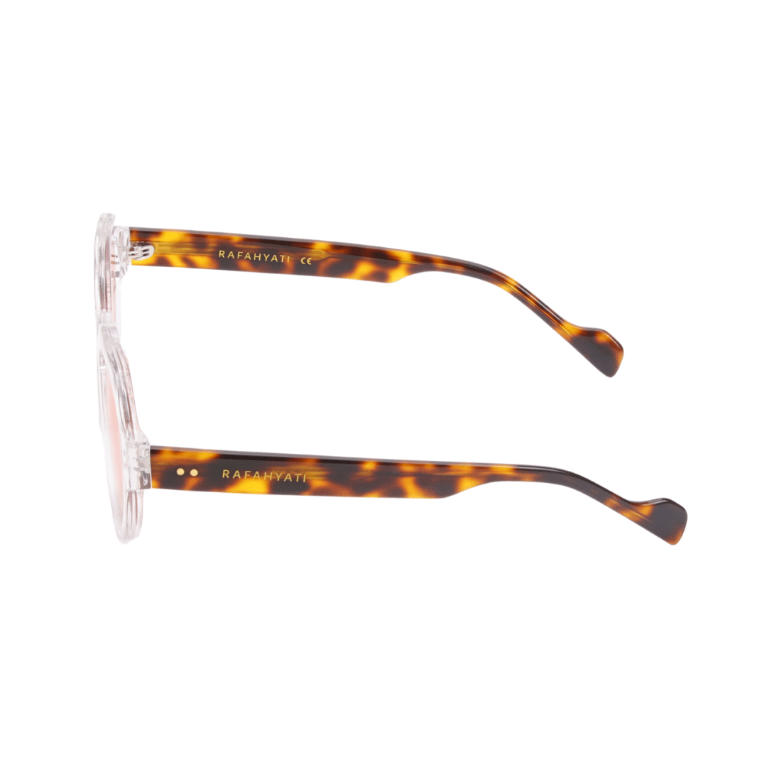 Affirmez votre style avec les lunettes de soleil Rafahyati, une fusion parfaite entre design contemporain et élégance intemporelle. Avec leur monture transparente subtilement rehaussée de branches en écailles de tortue, ces lunettes offrent une allure sophistiquée et unique.