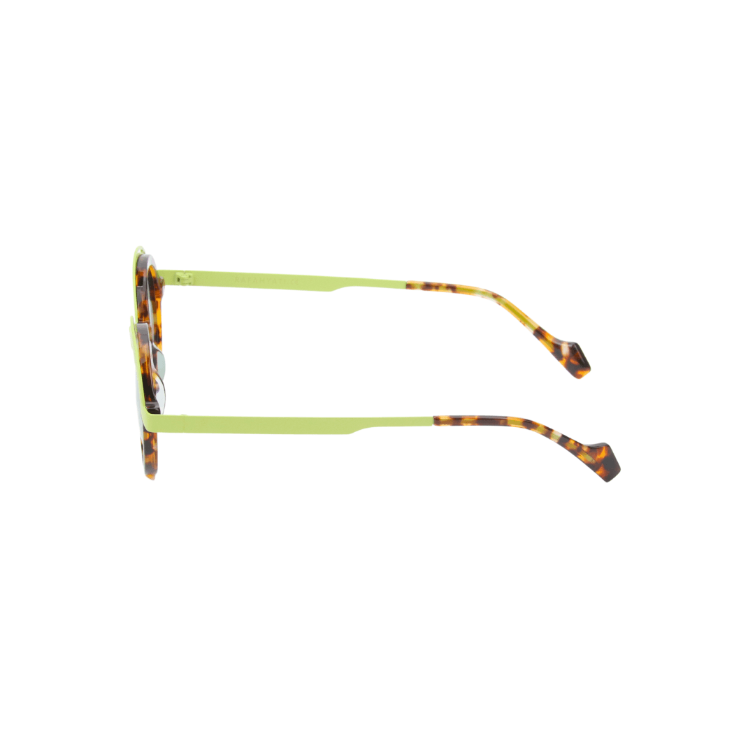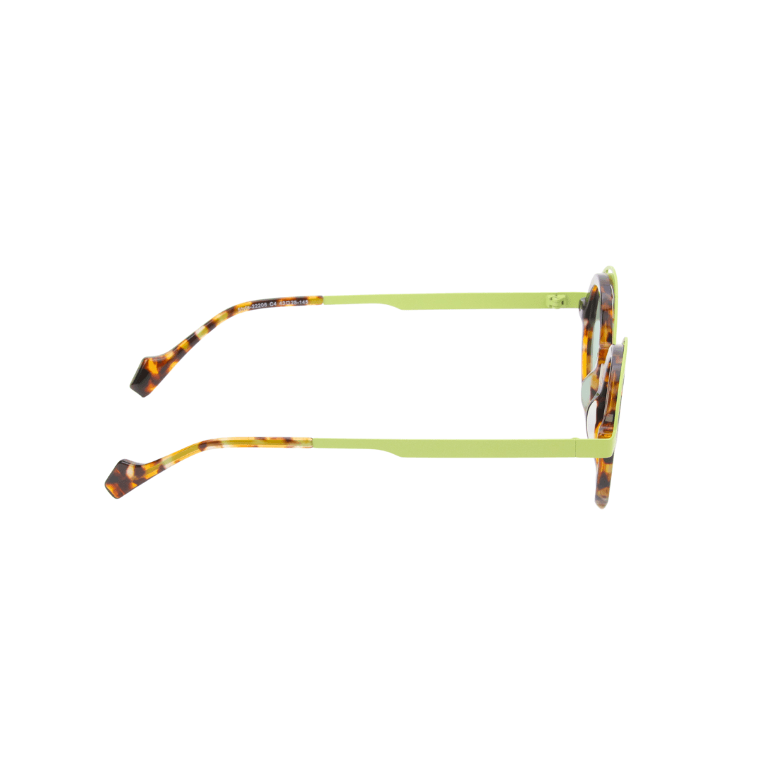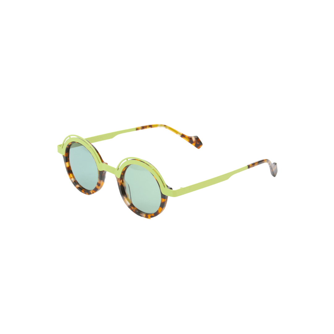 - Design : Monture ronde (round) avec un double cerclage métallique vert citron et une finition écaille de tortue, fusionnant modernité et style rétro.