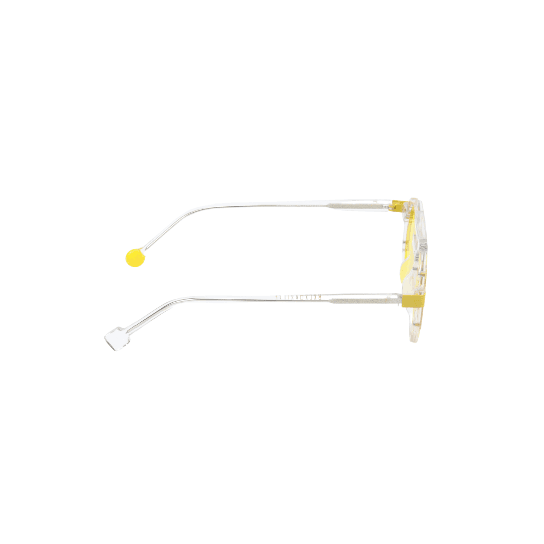 - Design : Monture ronde aux lignes géométriques affirmées, sublimée par une combinaison de couleurs jaune et transparente, apportant une touche futuriste et originale.