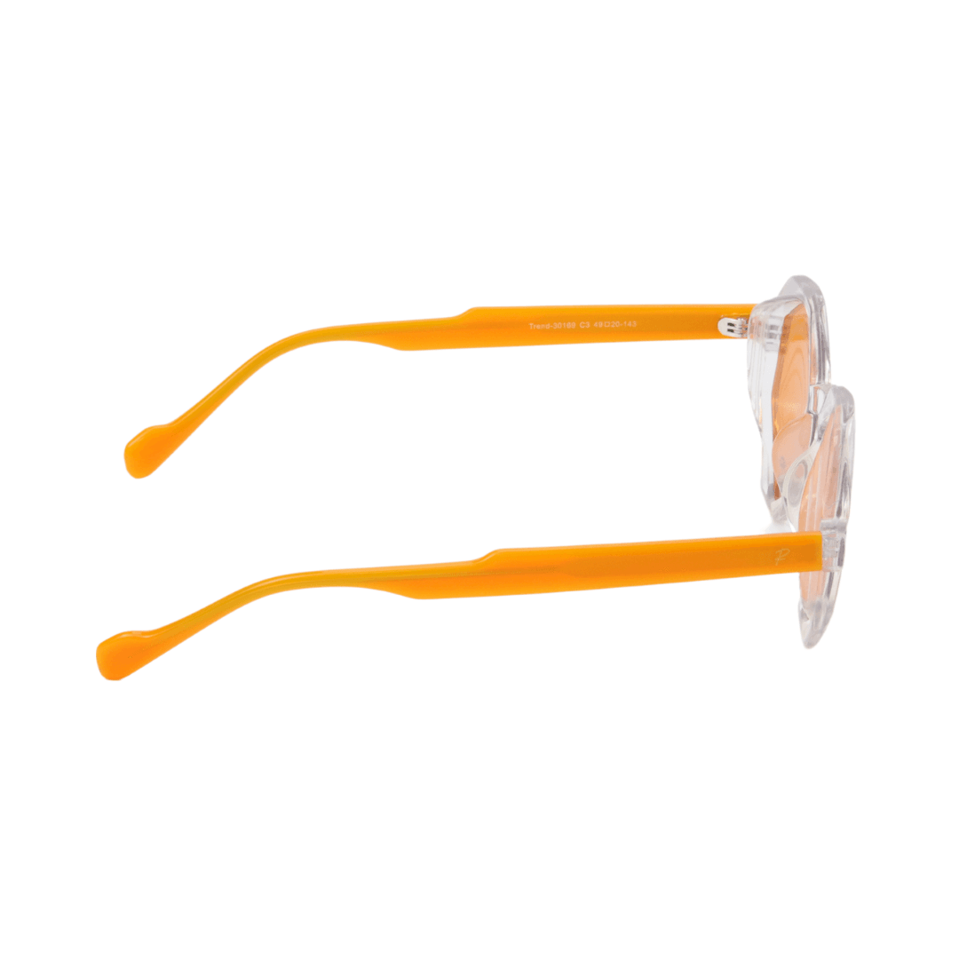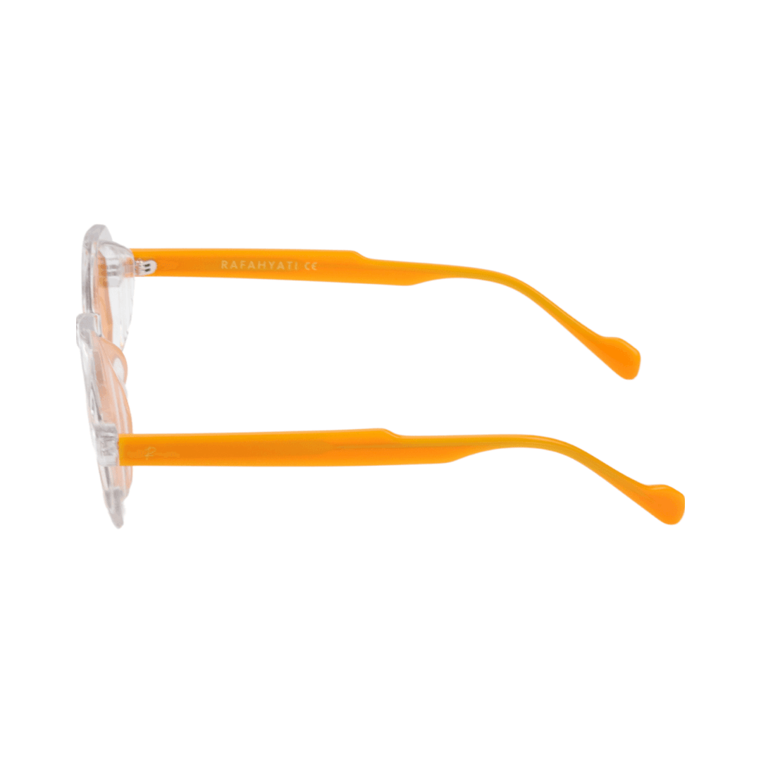 - Design : Monture hexagonale en acétate transparent avec des détails orange, alliant modernité et originalité.