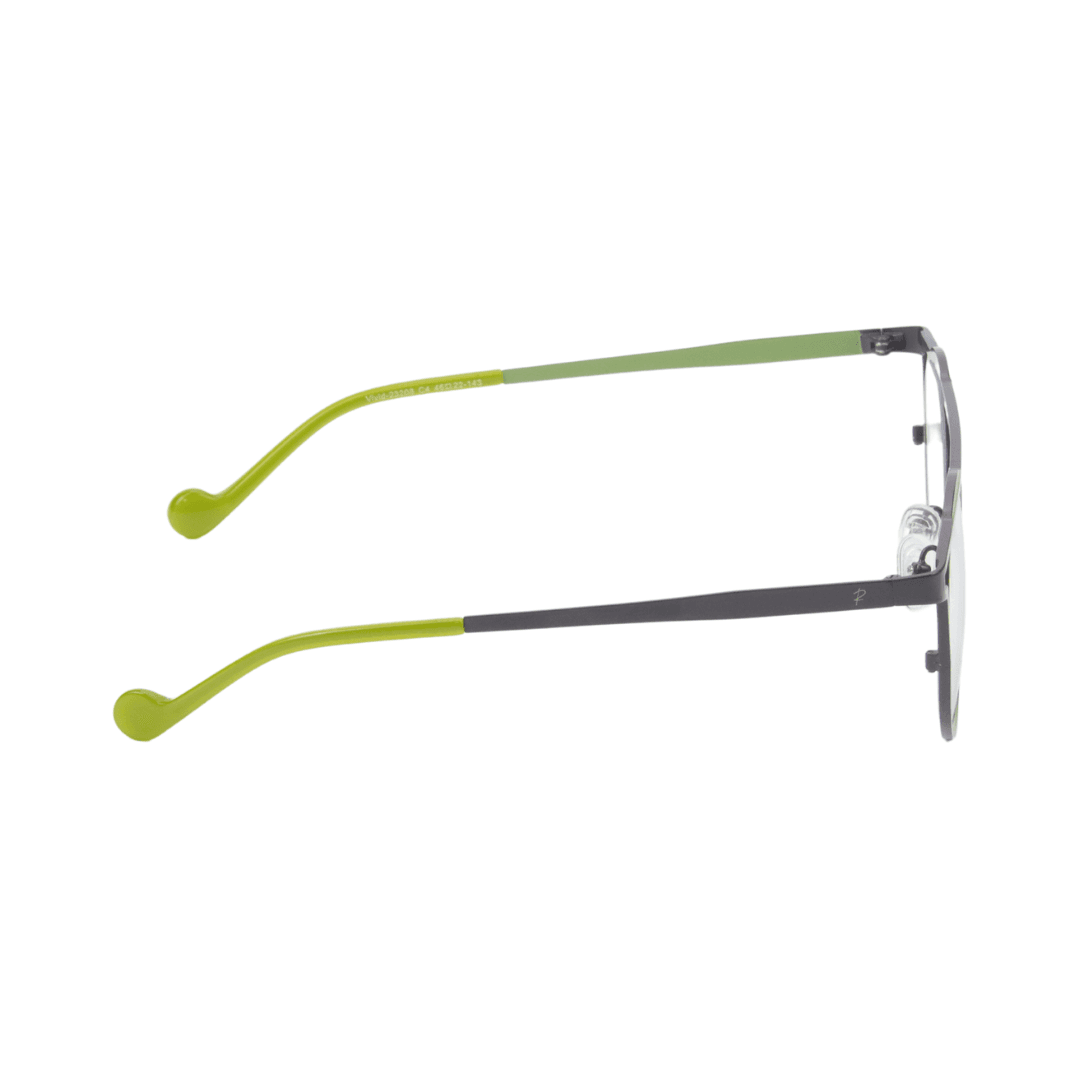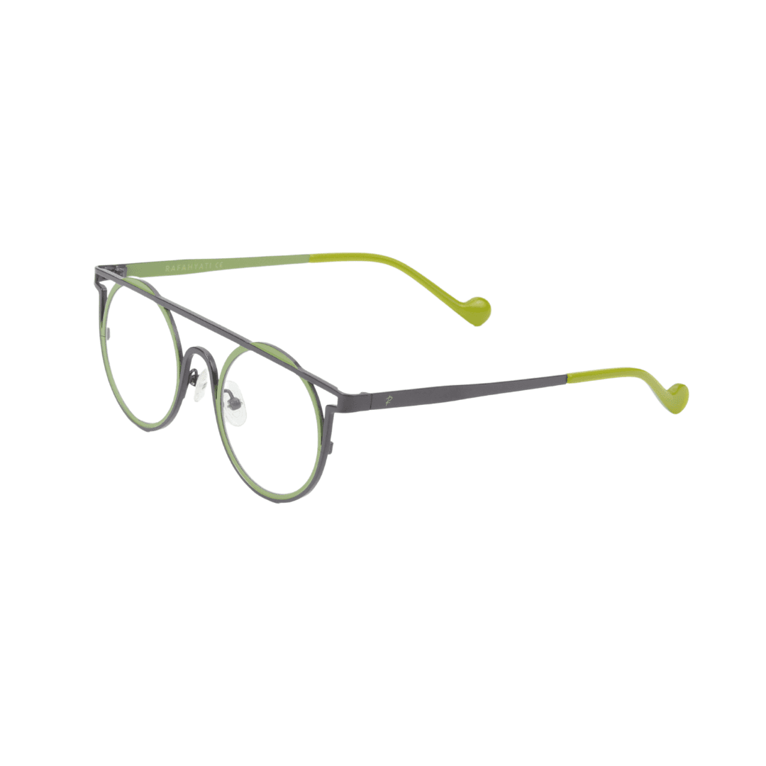 • Design : Monture ronde avec double pont et une finition métallique grise et verte, combinant élégance et modernité.