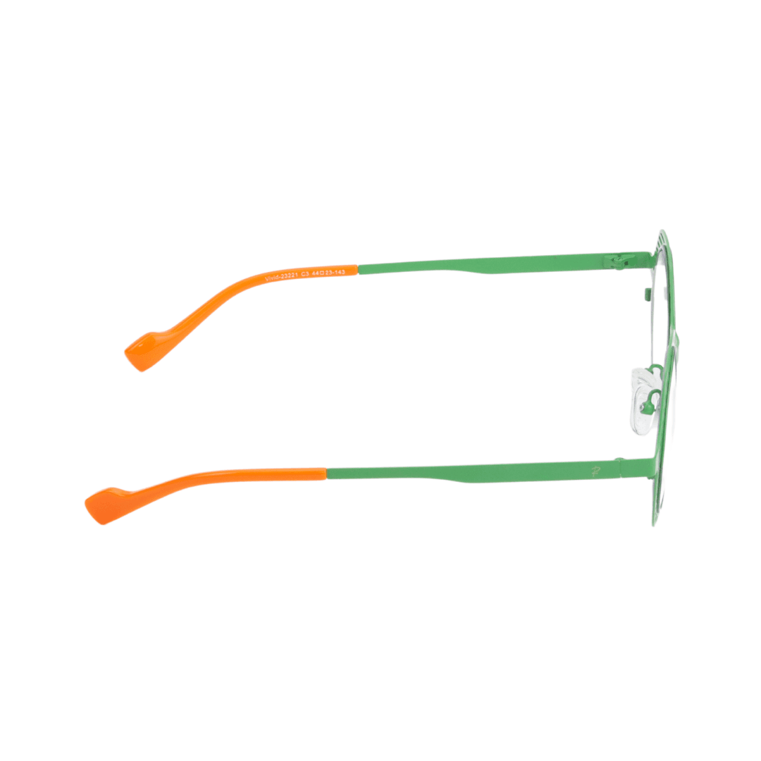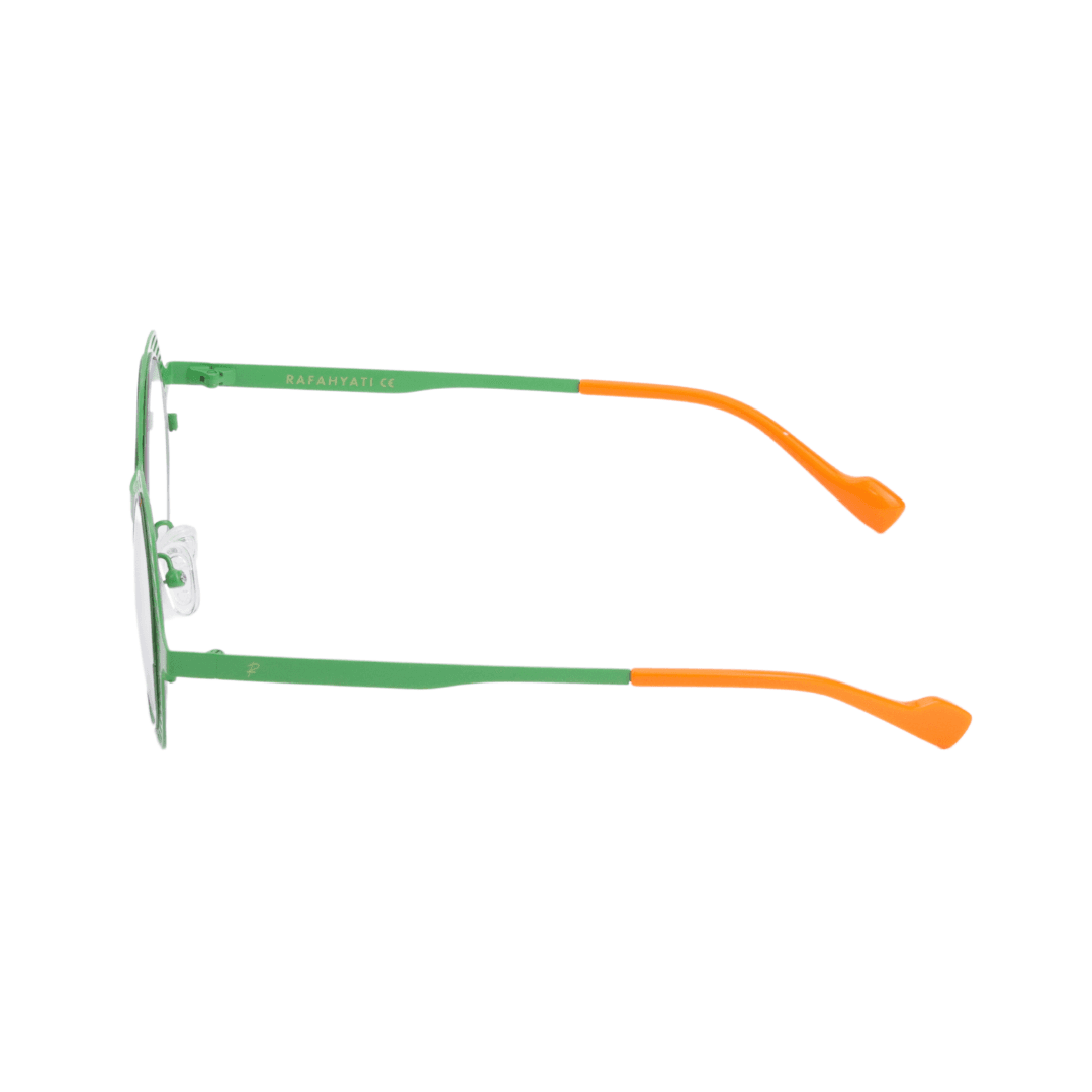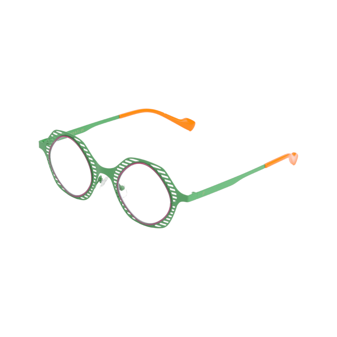 - Design : Monture ronde ajourée verte avec des détails colorés, combinant modernité et originalité.